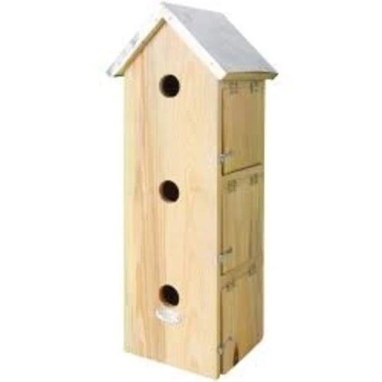Mussen zijn sociale diertjes, dat is maar goed ook want in deze leuke mussenflat van Esschert Design kan de hele familie mus bij elkaar blijven wonen. Het houten vogelhuisje heeft een zinken dakje en zorgt ervoor dat de familie mus geen natte voeten krijgt. De invliegopening van de huisjes is klein genoeg om grotere tuinvogels buiten de deur te houden. Kleinere vogels als mussen kunnen er natuurlijk wel bij!