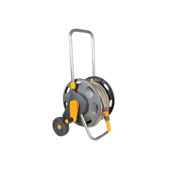 Deze handige slangenwagen met wielen heeft een verstelbaar handvat. En dat is nog niet alles, want deze wagen wordt geleverd inclusief tuinslang van 25 meter en koppelstukken. Met deze set heb je alles wat je nodig hebt om de tuin te besproeien. De tuinslang is gemakkelijk te vervangen door een andere slang tot 60 meter (∅ 12,5 mm).
