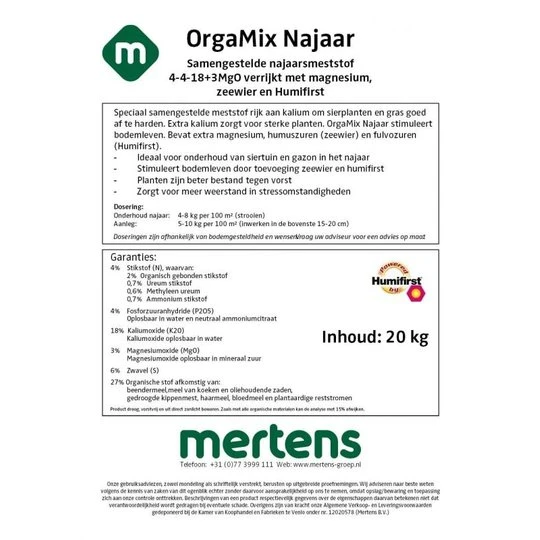 Speciaal samengestelde meststof rijk aan kalium om sierplanten en gras goed af te harden. Extra Kalium zorgt voor sterke planten. OrgaMix Najaar stimuleert bodemleven. Bevat extra Magnesium, Humuszuren (zeewier) en Fulvozuren (Humifirst)