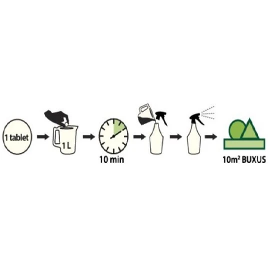 – 1 tablet oplossen in 1 ltr water. 10 minuten wachten tot dat de tablet helemaal is opgelost. Overgieten in een (druk)spuit en de buxus behandelen. Behandel de hele plant.