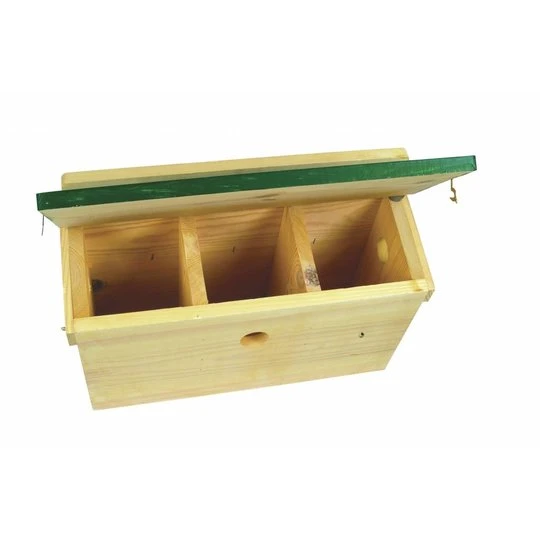 VBN Mussennestkast heeft drie compartimenten, waardoor er drie mussen bij elkaar kunnen broeden. De mus is namelijk een koloniebroeder. Bovendien heeft deze nestkast invliegopeningen van Ø 34 mm; ideaal voor de mussen.